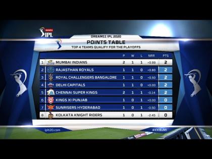 सुर्यकुमार यादव (47) आणि रोहितनं 54 चेंडूंत 3 चौकार व 6 षटकार खेचून केलेल्या 80 धावांच्या जोरावर MIला 20 षटकांत 5 बाद 195 धावा करता आल्या. मुंबई इंडियन्सच्या गोलंदाजांच्या चतूर माऱ्यासमोर इयॉन मॉर्गन आणि आंद्रे रसेल या बिग हिटर फलंदाजांनाही फटके मारता येत नव्हते. KKRला 20 षटकांत 9 बाद 146 धावा केल्या. या विजयानंतर मुंबई इंडियन्सनं ( MI) आयपीएल गुणतालिकेतही ( points table) खाते उघडले. जाणून घेऊया या सामन्यानंतर कोणता संघ कितव्या स्थानी.