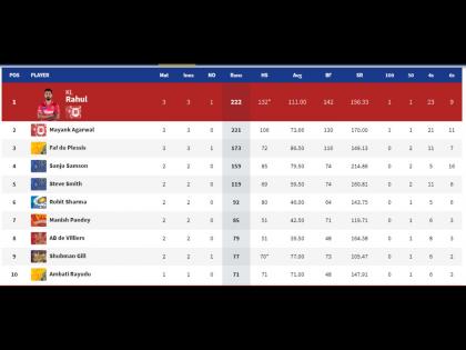 ऑरेंज कॅपच्या अर्थात सर्वाधिक धावा करणाऱ्या फलंदाजांमध्ये किंग्स इलेव्हन पंजाबच्या ( KXIP) दोन खेळाडूंमध्ये काँटे की टक्कर आहे. आजच्या सामन्यातील शतकवीर मयांक अग्रवाल ( Mayank Agarwal) तीन सामन्यांत 221 धावांसह दुसऱ्या स्थानी आहे. लोकेश राहुल ( KL Rahul) अवघ्या एका धावेनं अव्वल स्थानी आहे.