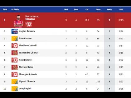 पर्पल कॅप अर्थात सर्वाधिक विकेट्स घेणाऱ्या गोलंदाजांत मोहम्मद शमी ( 7 बळी) अव्वल स्थानी आहे. दिल्ली कॅपिटल्सचा कागिसो रबाडा व चेन्नई सुपर किंग्सचा सॅम कुरन प्रत्येकी पाच विकेट्ससह अनुक्रमे दुसऱ्या व तिसऱ्या स्थानावर आहेत.