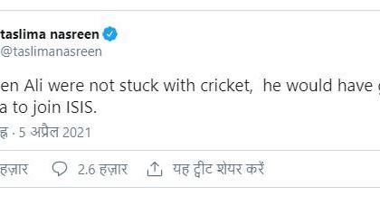 आपल्या लेखणीमुळे प्रसिद्ध असलेल्या तस्लीमा नसरीन यांनी इंग्लंडचा फिरकीपटू मोईन अलीबाबत एक ट्विट केलं होतं. "मोईन अली क्रिकेट खेळत नसता तर तो सीरियात जाऊन ISISचा आतंकवादी झाला असता'', असं वादग्रस्त ट्विट नसरीन यांनी केलं. त्यानंतर सोशल मीडियात एकच गहजब झाला. नसरीन यांच्या विधानावर जोरदार सुरू झाली.