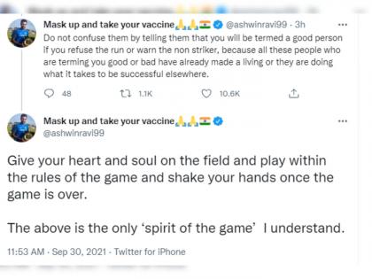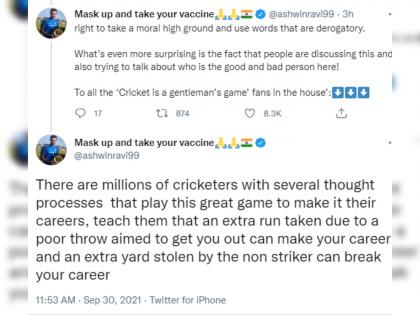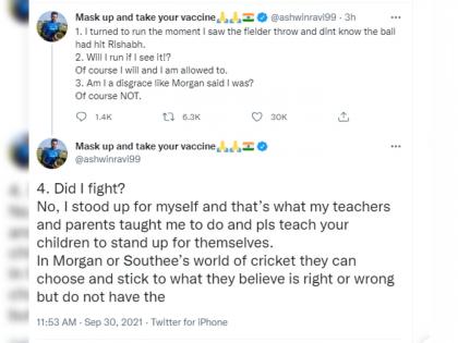 अश्विननं यावर मॉर्गनला फैलावर घेतले. तो म्हणाला,''खेळाडूनं चेंडू फेकला आहे, हे पाहताच मी धाव घेण्यासाठी पळालो आणि तो चेंडू रिषभ पंतला लागला आहे, हे मला माहीत नव्हतं. जर मी ते पाहिलं असतं, तर मी पळालो असतो का?, तर हा मी धाव घेण्यासाठी नक्की पळालो असतो आणि तसं करण्याची परवानगी मला आहे. मॉर्गनच्या बोलण्यानं मी वाईट व्यक्ती होतोय का?, मला तसं नाही वाटत. ''