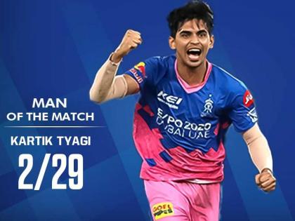 - सामन्याच्या अखेरच्या षटकात ६ चेंडूत अवघ्या ४ धावांची गरज असताना सॅमसननं 'लकी चॅम्प' कार्तिक त्यागीला गोलंदाजी दिली आणि त्यानं पंजाबला जोरदार धक्के द्यायला सुरुवात केली. अखेरच्या षटकात विजयासाठी अवघ्या ४ धावांची गरज आणि हातात ८ विकेट्स असूनही पंजाबला जिंकता आलं नाही. खरंतर त्यागीनं जिंकून दिलं नाही असंच म्हणावं लागेल. त्यागीनं अत्यंत चलाखीनं गोलंदाजी केली. ![]()