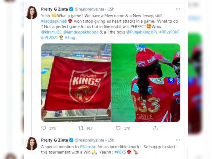 पंजाब किंग्सच्या या थरारक विजयानंतर सह मालकिण प्रीती झिंटानं लोकेश राहुल व संघाचे अभिनंदन केलं. तिनं ट्विट केलं की,''नवं नाव, नवी जर्सी तरीही हा संघ मला हार्ट अटॅक देण्याची संधी सोडत नाही. संघासाठी ही चांगली सुरूवात नाही, परंतु विजय मिळवला त्याचा आनंद आहे. संजू सॅमसनच्या खेळीचे कौतुक करावं तेवढं कमीच आहे.'' दीपक हुडानं २८ चेंडूंत कुटल्या ६४ धावा अन् कृणाल पांड्या होतोय ट्रोल; झाला होता मोठा राडा!