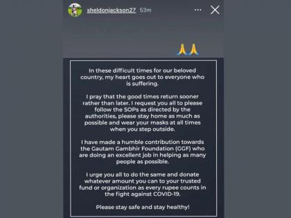''या संकट काळात अनेकांच्या वेदना पाहून माझं मन रडत आहे. चांगले दिवस लवकर येऊ दे, अशी प्रार्थना देवाकडे करतो. सरकारनं आखलेल्या सर्व नियमांचे पालन करा, अशी विनंती मी सर्वांना करतो. कृपया घरीच थांबा आणि जेव्हा बाहेर जाल तेव्हा न विसरता मास्क घाला. कोरोनाशी मुकाबला करण्यासाठी कार्यरत असलेल्या गौतम गंभीर फाऊंडेशनला मी माझ्याकडून मदत केली आहे. मी इतरांनाही मदतीचं आवाह करतो,''अशी पोस्ट शेल्डननं लिहिली आहे.