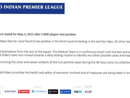 आयपीएलमध्ये आज अहमदाबादच्या नरेंद्र मोदी स्टेडियमवर कोलकाता नाइट रायडर्स विरुद्ध रॉयल चॅलेंजर्स बंगोलर यांच्यात लढत होणार होती. पण कोलकोता संघातील दोन खेळाडूंचा कोरोना रिपोर्ट पॉझिटिव्ह आल्यानं दोघंही आता विलगीकरणात गेले आहेत. यासोबत त्यांच्यासोबतच्या इतर सर्व खेळाडूंची कोरोना चाचणी निगेटिव्ह आल्याची माहिती बीसीसीआयनं दिली आहे. पण खबरदारी म्हणून आजचा सामान होऊ शकणार नाही, अशी माहिती देण्यात आली आहे.