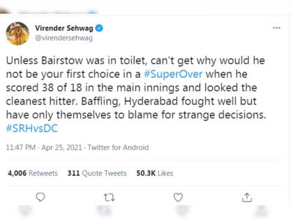 एकतर जॉनी बेअरस्टो टॉयलेटमध्ये असेल, नाहीतर सुपर ओव्हरमध्ये त्याला न पाठवण्यामागचं कारणच नव्हतं. त्यानं सामन्यात १८ चेंडूंत ३८ धावा चोपल्या होत्या आणि सुपर ओव्हरमध्ये क्लिन हिटरची गरज होती. हैदराबादनं चांगली लढत दिली, परंतु अचंबित करण्याच्य निर्णयाचा त्यांना फटका बसला आणि त्यासाठी त्यांनी स्वतःलाच जबाबदार धरायला हवं,'' असे वीरूनं ट्विट केलं.