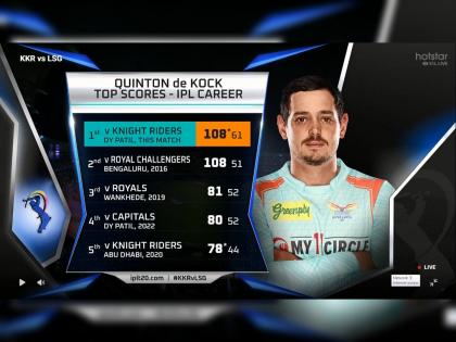 क्विंटनने ५९ चेंडूंत आयपीएलमधील दुसरे शतक पूर्ण केले. त्यात ६ चौकार व ७ षटकारांचा समावेश होता. '