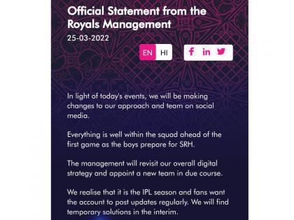 संपूर्ण घटनेबाबत राजस्थान रॉयल्सच्या संघ व्यवस्थापनाकडूनही एक निवेदन जारी करण्यात आलं. यात सोशल मीडिया टीम बदलण्याची माहिती देण्यात आली आहे. आज घडलेल्या घटनेची दखल घेत आम्ही संघाच्या सोशल मीडिया टीममध्ये बदल करण्याचा निर्णय घेतला आहे. संघात सर्वकाही आलबेल असून हैदराबादविरुद्धच्या सामन्यासाठी संघ जोरदार तयारी करत आहे. संघ व्यवस्थापन आपल्या डिजीटल स्ट्रॅटजीचा पुनर्विचार करेल आणि नवी सोशल मीडिया टीम नियुक्त केली जाईल. दरम्यान, आयपीएल आणि संघाच्या चाहत्यांना अपडेट्स हवे असतात याची काळजी घेऊन तातडीनं अंतरिम बदल केले जातील, असं प्रसिद्ध पत्रक राजस्थान रॉयल्स संघाच्या व्यवस्थापनाकडून जारी करण्यात आलं आहे.