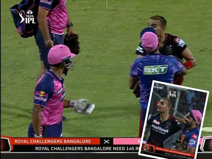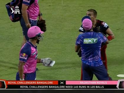 रियान परागने एकाकी झूंज देताना २९ चेंडूंत अर्धशतक पूर्ण केले. परागने ३१ चेंडूंत ३ चौकार व ४ षटकारांसह नाबाद ५६ धावा केल्या. राजस्थानने ८ बाद १४४ धावा केल्या. त्याने हर्षल पटेलने टाकलेल्या २०व्या षटकात १८ धावा चोपल्या. अखेरच्या चेंडूवर खणखणीत षटकार मारून पेव्हेलियनच्या दिशेने जाणाऱ्या रियानकडे पाहून हर्षल काही बडबडला. त्यानंतर रियान जाब विचारण्यासाठी माघारी फिरला. दोघांमध्ये वाद वाढणार लक्षात येताच RRच्या सपोर्ट स्टाफमधील सदस्याने हर्षलला रोखले.