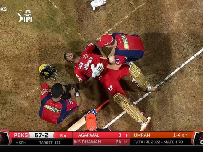 IPL 2022, Sunrisers Hyderabad vs Punjab KingsLive Updates : सनरायझर्स हैदराबादच्या १५८ धावांच्या लक्ष्याचा पाठलाग करताना पंजाब किंग्सने चांगली सुरुवात केली. जॉनी बेअरस्टो व शाहरुख खान हे दोघंही आक्रमक खेळी करून माघारी परतले. आता PBKSचा कर्णधार मयांक अग्रवाल व शिखर धवन मैदानावर आहे. ७व्या षटकात उम्रान मलिकच्या गोलंदाजीवर मयांक ( Mayank Agarwal) जखमी झाला. उम्रानने टाकलेला वेगवान चेंडू त्याच्या बरगडीवर जोरात आदळला आणि PBKSचा कर्णधार जमिनीवर आडवा झाला. बराच काळ तो मैदानावर पडून होता आणि त्याच्यावर प्राथमिक उपचार केले गेले. पेन किलर खाऊन तो खेळला, मात्र ८व्या षटकात तो झेलबाद झाला. ( पाहा IPL 2022 - SRH vs PBKS सामन्याचे लाईव्ह स्कोअरकार्ड )