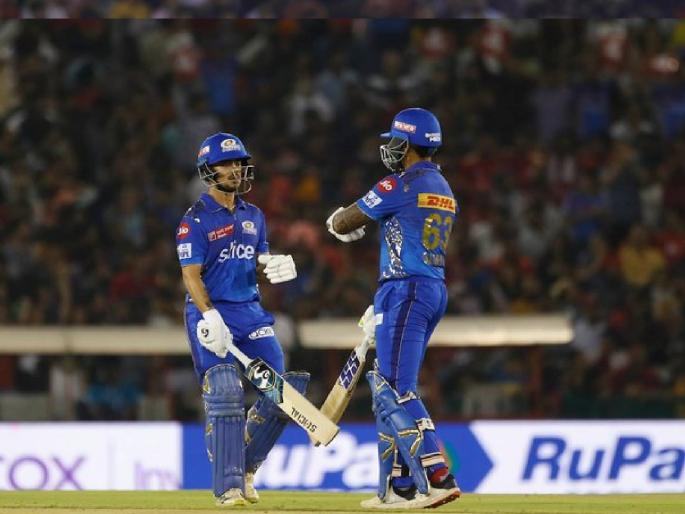 तगडे लक्ष्य समोर असताना रोहित शर्माने तिसराच चेंडू हवेत उडवला, परंतु मॅथ्यू शॉर्ट झेल घेण्यासाठी सज्ज होता. रिषी धवनने हिटमॅनला भोपळ्यावर माघारी पाठवले. रोहित आयपीएलमध्ये सर्वाधिक १५ वेळा शून्यावर बाद झाला आहे आणि त्याने दिनेश कार्तिक, सुनील नरीन व मनदीप सिंग यांच्या नावावर असलेल्या नकोशा विक्रमाशी बरोबरी केली. त्यानंतर इशान किशन व कॅमेरून ग्रीन यांनी अर्धशतकी भागीदारी करताना पॉवर प्लेमध्ये ५४ धावा करून दिल्या. सहाव्या षटकात नॅथन एलिसच्या गोलंदाजीवर ग्रीन ( २३) झेलबाद झाला. इम्पॅक्ट प्लेअर म्हणून सूर्यकुमार यादव मैदानावर उतरला. सूर्या व इशान या जो़डीने पंजाबच्या गोलंदाजांचा चांगलाच समाचार घेताना २९ चेंडूंत ५० धावांची भागीदारी केली.