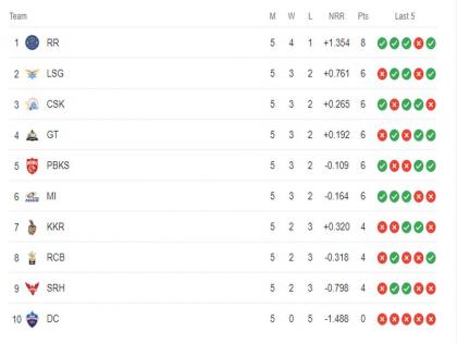 मुंबई इंडियन्सने सनरायझर्स हैदराबादविरुद्ध सामना जिंकत गुणतालिकेत सहाव्या स्थानी झेप घेतली आहे. राजस्थान रॉयल्स ५ सामन्यात ४ विजय मिळवत गुणतालिकेत अजूनही अव्वल स्थानी कायम आहे. तर लखनऊ सुपर जायट्स दुसऱ्या क्रमांकावर आहे. चेन्नई सुपरकिंग्स तिसऱ्या क्रमांकावर असून गुजरात टायटन्स चौथ्या क्रमांकावर आहे.