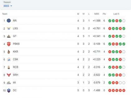 एकूण ४ पैकी ३ सामने जिंकत राजस्थान रॉयल्स ६ गुणांसह गुणतालिकत अव्वल स्थानावर आहे. तर तर लखनऊ सुपर जायट्स ५ सामन्यात ३ सामने जिंकत ६ गुणांसह दुसऱ्या क्रमांकावर आहेत. गुजरात टायटन्स तिसऱ्या क्रमांकावर असून पंजाब किंग्स चौथ्या क्रमांकावर आहे. कोलकाता नाइट रायडर्स पाचव्या क्रमांकावर, तर चेन्नई सुपर किंग्स सहाव्या क्रमांकावर आहे. रॉयल चॅलेंजर्स बंगळुरु सातव्या क्रमांकावर, सनराइस हैदराबाद आठव्या क्रमांकावर, मुंबई इंडियन्स नवव्या क्रमांकावर आणि दिल्ली कॅपिटल्स दहाव्या क्रमांकावर आहे.
