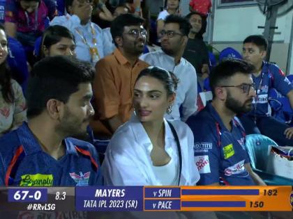 IPL 2023, Rajasthan Royals vs Lucknow Super Giants Live : लोकेश राहुल आणि कायल मायर्स यांनी लखनौ सुपर जायंट्सला चांगली सुरूवात करून दिली आहे. आयपीएल २०२३ मधील त्यांनी आतापर्यंतची पहिल्या विकेटसाठी सर्वोत्तम भागीदारीची नोंद केली. राजस्थान रॉयल्सच्या क्षेत्ररक्षकांनी दोन सोपे झेल सोडून KL Rahul ला जीवदान दिले. आजचा सामना पाहण्यासाठी स्टेडियमवर त्याची पत्नी व बॉलिवूड अभिनेत्री अथिया शेट्टी ( Athiya Shetty) आली होती आणि तिच्यासमोर आज लोकेश मोठी खेळी करेल असे वाटत होते. पण...