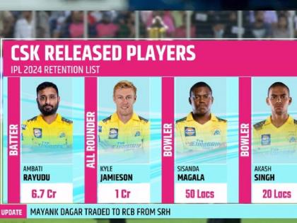 IPL 2024 Retention: इंडियन प्रीमिअर लीग २०२४ साठी १९ डिसेंबरला लिलाव पार पडणार आहे. त्याआधी आज १० फ्रँचायझीच्या रिटेन्शन लिस्ट जाहीर करण्यात आली. चेन्नई सुपर किंग्सने २०२२मध्ये जेतेपद उंचावताना आयपीएलमध्ये सर्वाधिक ५ जेतेपदांच्या मुंबई इंडियन्सच्या विक्रमाची बरोबरी केली होती. महेंद्रसिंग धोनीचा ती शेवटची आयपीएल असल्याची हवा मागील हंगामात झाली होती. पण, धोनीने तशी कोणतीच घोषणा केली नाही आणि आज CSKच्या रिटेन लिस्टमध्ये त्याचं नाव दिसल्याने चाहते आनंदीत झाले. महेंद्रसिंग धोनी आयपीएल २०२४ खेळणार असल्याचे यावरून स्पष्ट झाले. चेन्नईने ८ खेळाडूंना रिलीज केले आहे.