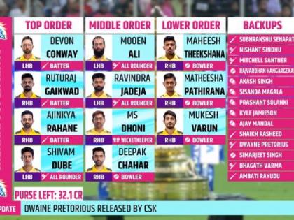 चेन्नई सुपर किंग्सने कायम राखलेले खेळाडू ( CSK Retained players list) - महेंद्रसिंग धोनी, रवींद्र जडेजा, डेव्हॉन कॉनवे, ऋतुराज गायकवाड, मोईन अली, शिवम दुबे, राजवर्धन हंगरगेकर, मिचेल सँटनर, दीपक चहर, तुषार देशपांडे, मथीशा पथिराणा, समिरजीत सिंग, प्रशांत सोलंकी, महीष थीक्षणा, अजिंक्य रहाणे, शेख राशीद, निशांत सिंधू, अजय मंडल ( MS Dhoni, Ravindra Jadeja, Devon Conway, Ruturaj Gaikwad, Moeen Ali, Shivam Dube, Rajvardhan Hangargekar, Mitchell Santner, Deepak Chahar, Tushar Deshpande, Matheesha Pathirana, Simarjeet Singh, Prashant Solanki, Maheesh Theekshana, Ajinkya Rahane, Shaik Rasheed, Nishant Sindhu, Ajay Mandal)