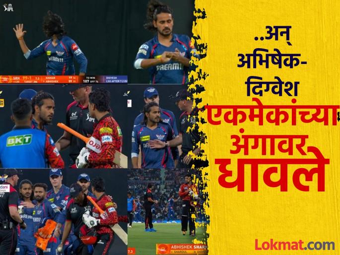 सनरायझर्स हैदराबादच्या डावातील आठव्या षटकात दिग्वेश राठी गोलंदाजीला आला. या षटकातील तिसऱ्या चेंडूवर मोठा फटका मारण्याच्या नादात अभिषेक शर्मा शार्दुल ठाकूरच्या हाती झेल देऊन बाद झाला.   दिग्वेश राठीनं आपले सिग्नेचर स्टाइल सेलिब्रशन करताना  अभिषेक शर्माला डिवचले. हातवारे करत चल नीघ...या तोऱ्यात दिग्वेशनं त्याला खुन्नस दिली. ही गोष्ट अभिषेक शर्माला खटकली अन् तो तंबूत परतण्याचे सोडून दिग्वेशच्या दिशेनं आला. दोघे एकमेकांच्या अंगावर धावून जात असल्याचे पाहायला मिळाले.  दोघांना रोखण्यासाठी अंपायर्संना आणि संघातील अन्य खेळाडूंना मध्यस्थी करावी लागली.