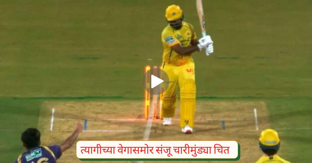 चेन्नई सुपर किंग्सच्या डावातील १२ व्या षटकात कार्तिक त्यागी आपले दुसरे षटक घेऊन आला. त्याच्या पहिल्याच स्लोवर चेंडूवर संजू सॅमसन याने उत्तुंग षटकार मारत ४८ धावांवर पोहचला. पुढच्याच चेंडूवर कार्तिक त्यागीनं कमालीच्या इनस्विंगवर संजू सॅमसनला चारीमुंड्याचित करत लेग स्टंप उडवली. संजू सॅमसन याने कोलकाता विरुद्ध ३२ चेंडूत ४ चौकार आणि ३ षटकारांच्या मदतीने १५० च्या स्ट्राईक रेटनं ४८ धावा केल्या.