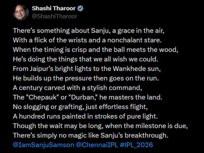 Shashi Tharoor Poem Sanju Samson Century MI vs CSK IPL 2026: मधील सामन्यात चेन्नई सुपर किंग्सच्या (CSK) संजू सॅमसननेमुंबई इंडियन्सविरुद्ध वानखेडे स्टेडियमवर ऐतिहासिक खेळी केली. संजूने अवघ्या ५४ चेंडूत १०१ धावा फटकावून मुंबईच्या गोलंदाजांचा धुव्वा उडवला. त्याच्या या नेत्रदीपक खेळीमुळे प्रभावित होऊन ज्येष्ठ काँग्रेस नेते शशी थरूर यांनी संजूवर एक विशेष कविता लिहून पोस्ट केली. इंग्रजी शब्दांचे आणि भाषेचे उत्तम ज्ञान असलेल्या थरूर यांनी इंग्रजीतून कविता लिहिले, त्याची सध्या सोशल मीडियावर जोरदार चर्चा आहे.