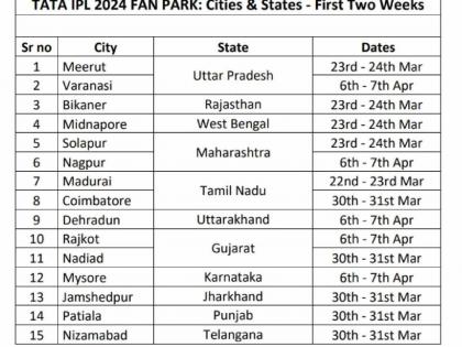 उत्तर प्रदेश, राजस्थान, पश्चिम बंगाल, महाराष्ट्र, तामिळनाडू, उत्तराखंड, गुजरात, कर्नाटक, झारखंड, पंजाब आणि तेलंगणा या ११ राज्यांत IPL 2024 च्या पहिल्या दोन आठवड्यांमध्ये फॅन पार्कचे आयोजन करण्यात येईल.