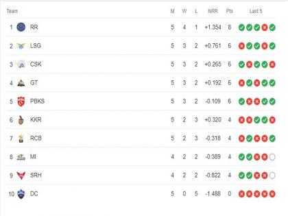 राजस्थान रॉयल्स ५ सामन्यात ४ विजय मिळवत गुणतालिकेत अजूनही अव्वल स्थानी कायम आहे. तर लखनऊ सुपर जायट्स दुसऱ्या क्रमांकावर आहे. गुजरात टायटन्स चौथ्या क्रमांकावर असून पंजाब किंग्स पाचव्या स्थानी आहे. कोलकाता नाईट रायडर्स सहाव्या स्थानी असून रॉयल चॅलेंजर्स बंगळुरु सातव्या क्रमांकावर आहे. ४ सामन्यात २ सामने जिंकत मुंबई इंडियन्स आठव्या स्थानी असून सनराजर्स हैदराबाद नवव्या क्रमांकावर आहे. दिल्ली कॅपिटल्सने ५ पैकी एकही सामना जिंकलेला नाही, त्यामुळे गुणतालिकेत दिल्लीचा संघ शेवटच्या म्हणजेच दहाव्या स्थानी आहे.