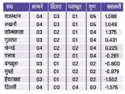 राजस्थानने चेन्नईविरुद्ध विजय मिळवत गुणतालिकेत अव्वल स्थानी कब्जा केला. एकुण ४ सामन्यात ३ विजय मिळवत ६ गुणांसह राजस्थान आता गुणतालिकेत अवल्ल स्थानी आहे. तर लखनऊ सुपर जायट्स ६ गुणांसह दुसऱ्या स्थानी आहे. राजस्थानला नेट रनरेट चांगला असल्याचा फायदा झाला आहे. आयपीएलच्या गुणतालिकेत तिसऱ्या क्रमांकावर कोलकता नाइट रायडर्स असून चौथ्या क्रमांकावर गुजरात टायटन्स आहे.