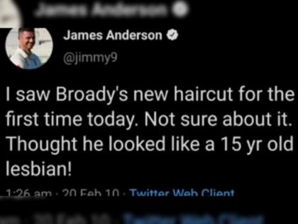 अँडरसननं त्या ट्विटमध्ये ब्रॉड हा 15 वर्षांच्या लेस्बीयनसारखा दिसतो, असे म्हटले होते. त्यामुळे अँडरसनवर होमोफॉबिक ट्विट करण्याचा आरोप केला गेला आहे. त्यानं ट्विटमध्ये लिहिलं होतं की, मी ब्रॉडीचा नवा हेअरकट आज पहिल्यांदा पाहिला. त्याच्याबाबतीत मी काहीच खात्री देऊ शकत नाही. तो 15 वर्षाच्या लेस्बीयन सारखा दिसतोय. ठरलं; राहुल द्रविड टीम इंडियाचा मुख्य प्रशिक्षक, शिखर धवनच्या खांद्यावर नेतृत्वाची जबाबदारी