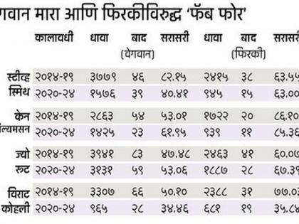 ३१ ऑगस्ट २०१४ रोजी, न्यूझीलंडचे माजी दिग्गज मार्टिन क्रो यांनी क्रिकेटमध्ये  'फॅब फोर' हा शब्दप्रयोग केला. त्यांच्यानुसार आधुनिक युगातील अव्वल चार कसोटी फलंदाज विराट कोहली, ज्यो रूट, स्टीव्ह स्मिथ आणि केन विल्यमसन या स्टार खेळाडूंचा समावेश होतो. २०१० नंतर कसोटी क्रिकेटमध्ये ‘फॅब फोर’चा वरचष्मा होता. त्याची साक्ष ही आकडेवारी देते. रूट, विल्यमसन, स्मिथ आणि कोहली यांनी २०१४-१९ या कालावधीत ५० च्या वर सरासरीने धावा केल्या. सर्वांनी ४० च्या वर कसोटी सामने खेळले. आता पाच वर्षांनंतरचे चित्र वेगळे आहे. विल्यमसन आणि रूट उत्कृष्ट फॉर्ममध्ये आहेत. रूटने लंकेविरुद्ध एका सामन्यात दोन शतके झळकावली. विराट आणि स्मिथ मात्र फॉर्मसाठी झगडत आहेत. ज्यो रूट याने मागच्या आठवड्यात जितकी शतके ठोकली, तितकी शतके विराट कोहलीने २०२०-२४ या चार वर्षांत नोंदविली. फॅब फोरच्या कामगिरीवर ‘इएसपीएन क्रिक इन्फो’ने रंजक आकडेवारी प्रसिद्ध केली आहे. लोकमतने आपल्या वाचकांसाठी ती उपलब्ध करून दिली असून त्यावर एक नजर टाकू या...