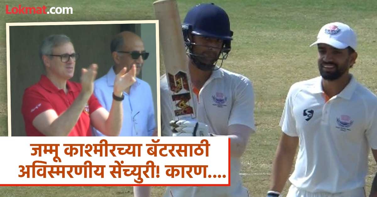 CM Omar Abdullah Clapping for Qamran Iqbal Who Scored Century During Ranji Trophy Finals हुबळी येथील कर्नाटक क्रिकेट असोसिएशनच्या मैदानात जम्मू काश्मीरच्या संघाने फलंदाजी आणि गोलंदाजीतील धमक दाखवली. पहिल्यांदा फायनल खेळणाऱ्या जम्मू काश्मीरच्या संघासमोर आठ वेळचा रणजी चॅम्पियन कर्नाटक संघ हतबल झाल्याचे दिसले. पहिल्या डावात ५८४ धावा करुन कर्नाटकच्या संघाला २९३ धावांवर आटोपल्यावर दुसऱ्या डावातही जम्मू काश्मीरच्या बॅटर्संनी धमक दाखवली. पाचव्या आणि अखेरच्या दिवशी ऐतिहासिक जेतेपदाची औपचारिकता बाकी असताना जम्मू काश्मीरच्या कामरान इक्बाल याने दमदार शतक झळकावले. हा क्षण या बॅटरसाठी अविस्मरणीय असाच आहे. त्याच्या शतकाला स्टेडियमवर उपस्थितीत असलेल्या जम्मू काश्मीरचे मुख्यमंत्री ओमर अब्दुल्ला यांनीही उभे राहून टाळ्या वाजवत दाद दिल्याचे पाहायला मिळाले. हा व्हिडिओ सोशल मीडियावर व्हायरल होताना दिसत आहे.