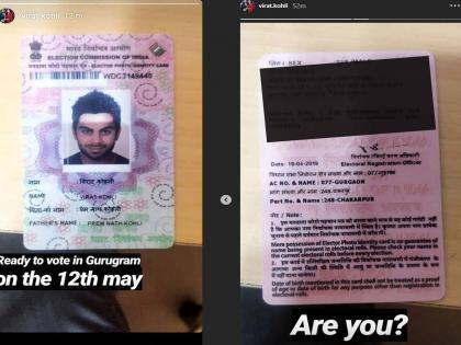 नवी दिल्ली- टीम इंडियाचा कर्णधार विराट कोहलीसुद्धा लवकरच मतदान करणार आहे. इन्स्टाग्रामवर कोहलीनं मतदान ओळखपत्राचा फोटो शेअर केला आहे. 30 वर्षांचा कोहली लिहितो, 12 मे रोजी मी गुरुग्राममध्ये जाऊन मतदान करणार आहे, तुम्ही मतदानासाठी तयार आहात का?, या मतदान ओळखपत्रावर कोहलीच्या संबंधित वैयक्तिक माहिती देण्यात आली आहे. मतदान ओळखपत्रावर कोहलीच्या वडिलांचं नाव आणि त्यांचा पत्ता देण्यात आला आहे.