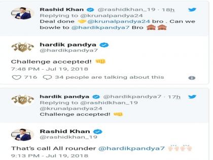 कृणालच्या या ट्विटवर अफगाणिस्तानचा लेग स्पीनर रशीद खान याने त्वरित रिप्लाय केले आणि त्याने कृणालला असे चेंडू टाकण्यावर काम करण्याचा सल्ला दिला. कृणालने हा सल्ला स्वीकारला, परंतु त्याचा वापर एकमेकांविरूद्ध करणार नाही असा सल्लाही दिला. त्यावर रशीदने असा बाऊंसर भाऊ हार्दिकला टाकण्याचा सल्ला दिला. हार्दिकने लगेच हे चॅलेंज स्वीकारले.