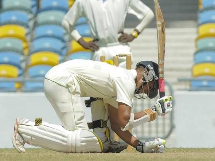 तेजनारायणने एका बाजूने दमदार खेळ सुरू करताना प्रथम श्रेणी क्रिकेटमधील पहिले शतक पूर्ण केले. अॅश्टन अॅगरला सलग चौकार खेचून त्याने तिहेरी धावांचा पल्ला ओलांडला. तेजनारायण २९३ चेंडूंचा सामना करताना १३ चौकार व १ षटकार खेचून ११९ धावांवर माघारी परतला. विंडीजच्या डावात षटकार खेचणारा तो एकमेव फलंदाज ठरला. विंडीजने दिवसअखेर ७ बाद २३४ धाव केल्या आहेत आणि अजूनही ८८ धावांनी पिछाडीवर आहेत.