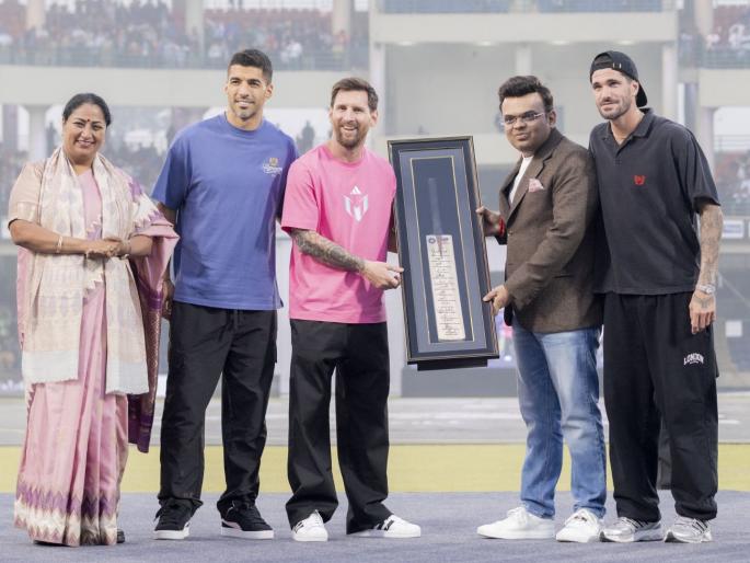 Lionel Messi GOAT India Tour 2025 : अर्जेंटिनाचा दिग्गज फुटबॉलपटूलिओनेल मेस्सीनं (Lionel Messi) दिल्लीतील भेटीसह भारत दौऱ्याची सांगता केली. GOAT इंडिया टूरदरम्यान कोलकाता शहरातून सुरु झालेला त्याचा दौरा दिल्लीत संपला. राजधानीतील 'द लीला पॅलेस'मध्ये आयोजित ‘मीट अँड ग्रीट’ कार्यक्रमानंतर फुटबॉल जगतात अधिराज्य गाजवणारा आणि भारतीय चाहत्यांच्या गळ्यातील ताईत असलेल्या मेस्सीनं अरुण जेटली स्टेडियमवर हजेरी लावली. यावेळी दिल्लीच्या मुख्यमंत्री रेखा गुप्ता यांच्यासह ICC चे अध्यक्ष जय शाह यांनी मेस्सीचं स्वागत केल्याचे पाहायला मिळाले.