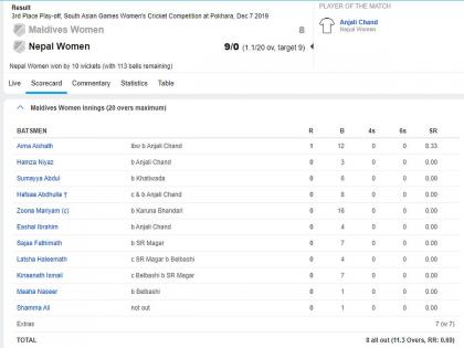मालदिवला प्रथम फलंदाजी करताना केवळ 8 धावा करता आल्या. मालदिवची सलामीवीर ऐमा ऐशाथनं एक धाव केली. तिच्याव्यतिरिक्त एकाही फलंदाजाला भोपळा फोडता आला नाही. अंजलीनं 4 षटकांत 1 धाव देत 4 विकेट्स घेतल्या. तिला सिता राणा मगर ( 2/0) आणि रुबीना छेत्री ( 2/0) यांनी प्रत्येकी दोन विकेट्स घेतल्या. सुमन खाटीवाडा आणि करुणा भंडारी यांनी प्रत्येकी एक विकेट घेतली. नेपाळनं 9 धावांचे लक्ष्य 7 चेंडूंत पार केले. काजल श्रेष्ठा ( 2) आणि रोमा थापा ( 5) यांनी हा विजय मिळवून दिला.