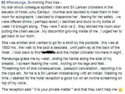 श्रीलंकेच्या अर्जुन रणतुंगाने मुंबईतील एका हॉटेलमध्ये आपल्यावर लैंगिक अत्याचार केल्याचा आरोप भारतातील फ्लाईट अटेंडंटने केला आहे. घडलेला सर्व प्रकार तिने आपल्या फेसबुक पोस्टवर लिहिला आहे. 1996 च्या विश्वविजेत्या श्रीलंकन संघाचा कर्णधार रणतुंगा भारत दौऱ्यावर असताना हा प्रकार घडल्याचे त्या महिलेने सांगितले आहे. यात तिने सालाची माहिती दिलेली नाही. तिने लिहिले की,''भारत दौऱ्यावर आले असताना रणतुंगाने चुकीच्या पद्धतीने माझ्या कमरेत हात घातला होता. त्यानंतर मी रिसेप्शनकडे धावत गेले, परंतु त्यांनी हा तुमचा वैयक्तीक मुद्दा असल्याचे सांगितले. त्यांनी मला मदत केली नाही.''