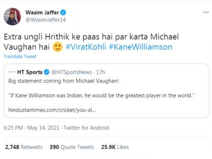 इंग्लंडचा माजी कर्णधार मायकल वॉन ( Michael Vaughan) आणि भारताचा माजी सलामीवीर वासिम जाफर ( Wasim Jaffer) यांच्यात सोशल मीडियावर शाब्दिक द्वंद्व रंगलेलं पाहायला मिळालं. विराट कोहलीच्या प्रगतीवर जळणाऱ्या वॉननं न्यूझीलंडचा केन विलियम्सन हा जगातील सर्वोत्तम खेळाडू असल्याचं मत मांडलं होतं. त्यावरून जाफरनं त्याच्या मिश्कील शैलीत वॉनचा समाचार घेतला.