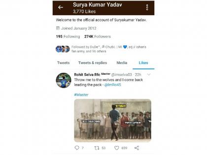 विराट कोहलीच्या नेतृत्वाखाली खेळणाऱ्या रॉयल चॅलेंजर्स बंगळुरू ( RCB) संघाविरुद्ध त्यानं ७९ धावांची तुफानी खेळी केली होती. त्याच्या खेळीचं सर्वांनी कौतुक केलं. या सामन्यात विराटनं त्याच्याशी स्लेजिंग केली होती. फलंदाजी करणाऱ्या सूर्याला विराट डोळे वटारून पाहताना सर्वांनी पाहिलं आणि दुसऱ्या दिवशी त्याचीच चर्चा रंगली. आता सूर्यकुमारनं सोशल मीडियावर विराटला ट्रोल करणाऱ्या पोस्टला लाईक करून नवीन चर्चेला वाचा फोडली आहे. पण, सूर्यानं लगेच ती पोस्ट अनलाईकही केली. या पोस्टमध्ये क्रिकेट चाहत्यानं विराटला 'पेपर कॅप्टन' ( कागदावरील कर्णधार) असे संबोधले होते. सूर्यानं लाईक्स केलेल्या पोस्टचा स्क्रीनशॉट व्हायरल झाला आहे. सूर्यकुमार यादव 'त्या' मुलीचे नृत्य पाहून झाला क्लिन बोल्ड अन् सुरू झाली Love Story!