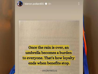 मुंबई इंडियन्स संघाचे फलंदाजी प्रशिक्षक किरॉन पोलार्डने एक विचित्र इंस्टाग्राम स्टोरी पोस्ट केली आहे जी आता व्हायरल होत आहे. पोलार्डने एक फोटो पोस्ट केला आहे आणि ज्यामध्ये असे लिहिले आहे की पाऊस संपला की प्रत्येकाला छत्री एक ओझे वाटू लागते. त्याचप्रमाणे, जेव्हा प्रामाणिकपणा संपतो तेव्हा फायदे थांबतात.