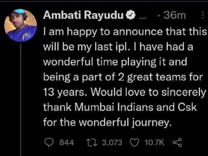 दरम्यान,२०१९ च्या वन डे विश्वचषक स्पर्धेत रायडूला टीम इंडियात स्थान मिळाले नाही. त्यानंतर त्याने तडकाफडकी आंतरराष्ट्रीय क्रिकेटमधून निवृत्ती जाहीर केली होती. त्यानंतर गेल्या काही दिवसांत चेन्नईच्या ताफ्यात सर्वत्र अलबेल नाही अशी चर्चा सुरू असतानाच रायडूने अशी घोषणा ट्वीटद्वारे केली. त्यामुळे साऱ्यांच्याच भुवया उंचावल्या होत्या. त्यानंतर काही वेळात त्याने ते ट्वीट डिलीट केल्यामुळे आता विविध चर्चांना उधाण आले आहे.