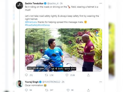 तेंडुलकरनं लिहिलं की,''क्रिकेटचं मैदान असो किंवा रस्त्यावर टू व्हिलर चालवणे असो, हेल्मेट घालणं महत्त्वाचं आहे. रस्त्यावरील सुरक्षिततेला हलक्यात घेऊ नका आणि हेल्मेट घालून नेहमी स्वतःला सुरक्षित ठेवा. या महत्त्वाचा संदेश तुमच्यापर्यंत पोहोचवण्यासाठी मला मदत करणाऱ्या ब्रायन लाराचे आभार.''