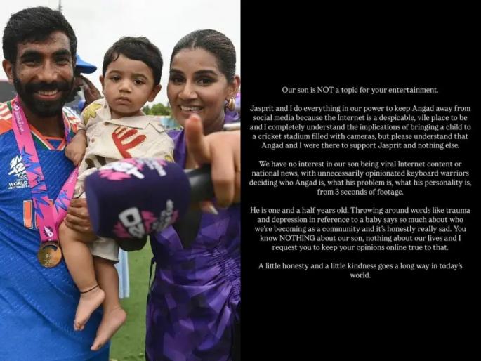 संजनाने आपल्या पोस्टमध्ये लिहिले आहे की, 'आमचा मुलगा तुमच्या मनोरंजनासाठी नाही. जसप्रीत बुमराह आणि मी नेहमीच अंगदला सोशल मीडियापासून दूर ठेवण्याचा सर्वतोपरी प्रयत्न करतो. कारण इंटरनेट हे एक घृणास्पद आणि घाणेरडे ठिकाण आहे.  अंगद आणि मी फक्त जसप्रीतला पाठिंबा देण्यासाठी तिथे होतो. याव्यतिरिक्त दुसरे काहीच कारण नाही. आमचा मुलगा इंटरनेटवर व्हायरल झाला पाहिजे किंवा बातम्यांमध्ये झळकला पाहिजे, यात आम्हाला काहीही रस नाही, जिथे लोक अवघ्या ३ सेकंदांत अंगद कोण आहे? त्याची समस्या काय आहे आणि त्याचे व्यक्तिमत्व कसे आहे? हे ठरवत आहेत.'