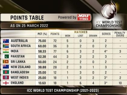 पाकिस्तान- ऑस्ट्रेलिया कसोटी मालिकेपूर्वी भारतीय संघ WTC points table 2021-23 मध्ये चौथ्या क्रमांकावर होता. ऑस्ट्रेलिया ( ७७.७७), पाकिस्तान ( ६६.६६) आणि दक्षिण आफ्रिका ( ६०.००) हे भारताच्या पुढे होते. आजच्या निकालाने भारतीय संघ तिसऱ्या क्रमांकावर सरकला आहे. पाकिस्तानची चौथ्या क्रमांकावर घसरण झाली आहे.