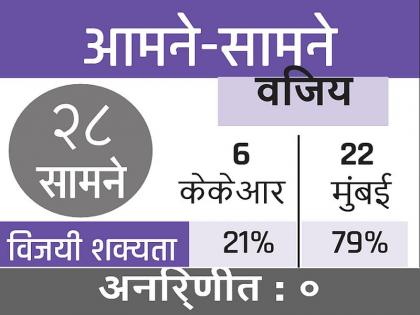 दुसरीकडे केकेआरने आरसीबीवर नऊ गडी राखून दमदार विजयाची नोंद केली. ही कामगिरी कायम राखण्याचे त्यांचे प्रयत्न आहेत. गुणतालिकेत आठ गुणांसह चौथ्या स्थानी असलेल्या मुंबईने नेहमीसारखी संथ सुरुवात केली असली, तरी मुसंडी मारण्यात कसलीही कसर राखणार नाही, असा व्यवस्थापनाला विश्वास आहे. त्यासाठी चेन्नईविरुद्ध विजयी पाठलाग करताना झालेल्या चुका फलंदाजांना सुधाराव्याच लागतील. १५६ धावांचा पाठलाग करताना सौरभ तिवारीचा अपवाद वगळता अन्य फलंदाज कुचकामी ठरले होते.