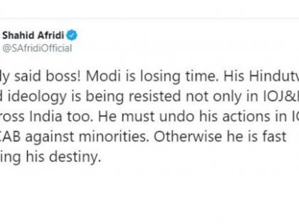 आफ्रिदी आपल्या ट्विटमध्ये म्हणाला की, " तुम्ही एकदम बरोबर म्हटले आहे. मोदी यांची वेळ भरत आली आहे. हिंदुत्वावर आधारीत असलेल्या त्यांच्या आदर्शांचा आता विरोध केला जात आहे. फक्त जम्मू आणि काश्मीरमध्ये नाही तर संपूर्ण भारतात मोदी यांना विरोध केला जात आहे. त्यांनी नागरीकत्व कायदा मागे घ्यायला हवा."