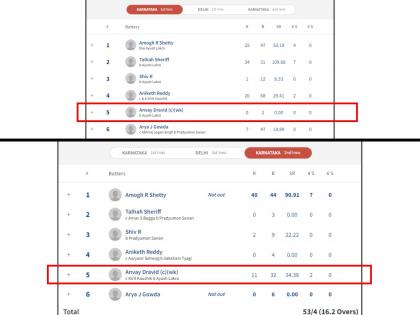 विजय मर्चंट ट्रॉफीचे सामने सध्या सुरू आहेत. यात अंडर-16 स्पर्धेत कर्नाटकचा सामना दिल्लीशी आहे. कर्नाटकचे नेतृत्व राहुल द्रविडचा धाकटा मुलगा अन्वय द्रविड करत आहे. तर सेहवागचा मुलगा आर्यवीर हा दिल्लीकडून खेळत आहे. या तीन दिवसीय सामन्याचा आज दुसरा दिवस आहे. पहिल्या दिवशी कर्नाटक संघाने फलंदाजी करताना ५६.३ षटकांत १४४ धावा केल्या आणि डाव संपुष्टात आला. द्रविडचा मुलगा अन्वय या डावात काहीही करू शकला नाही. त्याला आयुष लाक्राने दोन चेंडूत शून्यावर बाद केले. दुसऱ्या डावातही त्याला आयुष लाक्रानेच ११ धावांवर बाद केले.