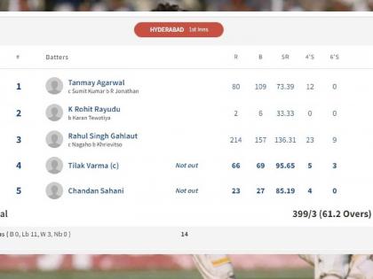 राहुलने १५७ चेंडूंत २३ चौकार व ९ षटकारांसह २१४ धावा केल्या. त्याच्या विकेटनंतर तिलक वर्मा व चंदन सहानी यांनी डाव सावरला आहे. तिलक ६६ धावांवर, तर चंदन २३ धावांवर खेळतोय.