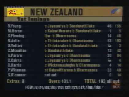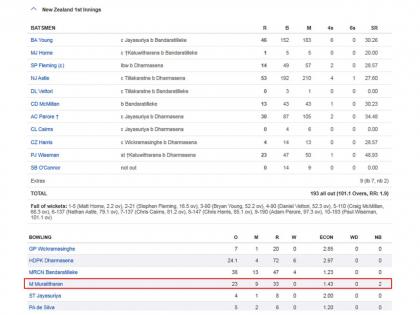 या सामन्याच्या पहिल्या डावात किवींचे सर्वच्या सर्व दहा फलंदाज फिरकीपटूंनी बाद केले होते. त्या डावात मुरलीनं 23 षटकं टाकली, परंतु त्याला एकही विकेट मिळाली नाही. क्रिकेटच्या इतिहासात असे प्रथमच घडले असेल की, फिरकीपटूंनी संपूर्ण संघ बाद केला, परंतु मुरलीची झोळी रिकामी राहिली. लंकेच्या कुमार धर्मसेनानं 24.1 षटकांत 72 धावांत 6 विकेट्स घेतल्या. निरोशान बंदारातिल्लेकेनं 38 षटकांत 47 धावा देत 4 विकेट्स घेतल्या. मुरलीनं 23 षटकांत 33 धावा दिल्या.