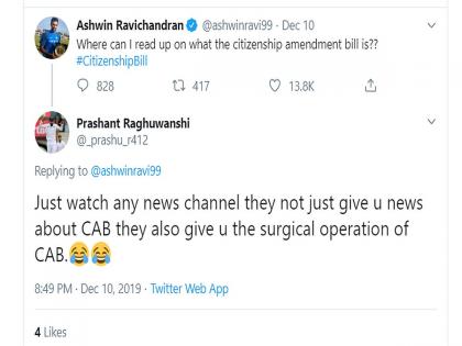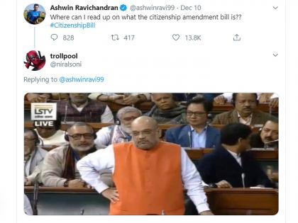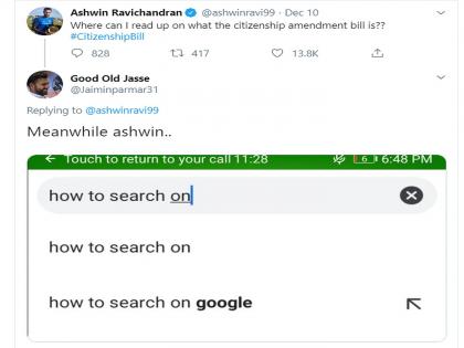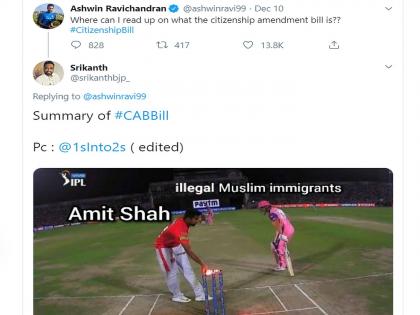 नागरिकत्व सुधारणा कायद्याविरोधात देशभरात विविध राज्यांत आंदोलनं सुरु आहेत. केंद्र सरकरानं नुकतंच नागरिकत्व सुधारणा विधेयक लोकसभा व राज्यसभ्येत पास करून घेतलं. त्यानंतर या विधेयकाला विरोध होताना दिसत आहे. पण, नागरिकत्व सुधारणा विधेयक म्हणजे नेमकं काय, असा प्रश्न भारताचा फिरकीपटू आर अश्विननं विचारला. त्यावरून नेटीझन्सनी भन्नाट उत्तरं दिली...