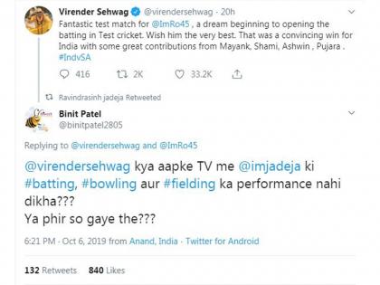 रवींद्र जडेजाच्या चाहत्यानं सेहवागला खोचक प्रश्न विचारला. त्यानं लिहिलं की, सेहवाग तुझ्या टीव्हीत जडेजाची गोलंदाजी, फलंदाजी आणि क्षेत्ररक्षण दिसले नाही का? का तू त्यावेळेस झोपला होतास?''
