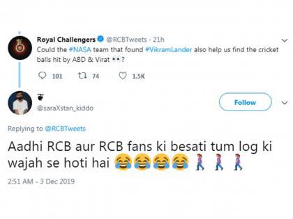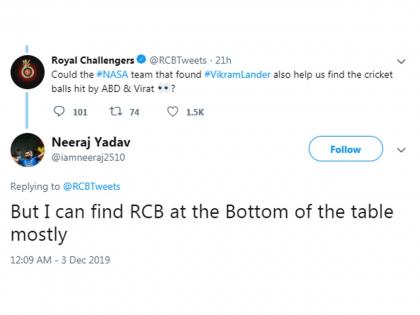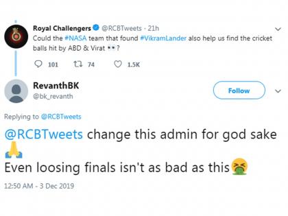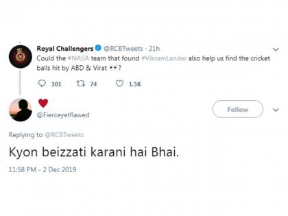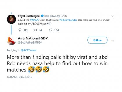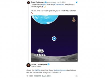 अमेरिकेची अंतराळ संस्था 'नासा'नंचांद्रयान-2 मोहिमेबद्दल मोठी माहिती दिली. 7 सप्टेंबर रोजी चंद्रावर अलगद उतरण्याऐवजी आदळून नष्ट झालेल्या ‘चांद्रयान-२’ मोहिमेतील विक्रम लॅण्डरचे अवशेष नेमके कुठे व कशा अवस्थेत आहेत याचा शोध घेण्यात यश आले आहे. चेन्नईच्या षण्मुग सुब्रमणियन या तरुण अभियंत्याने दिलेल्या माहितीची मोलाची मदत झाली, अशी पोचपावती नासाने दिली आहे. या यशानंतर इंडियन प्रीमिअर लीगमधील रॉयल चॅलेंजर्स बंगळुरू ( RCB) संघानं नासाला एक चॅलेंज दिलं. पण, विराट कोहलीच्या संघावर तोंडावर आपटण्याची वेळ आली.